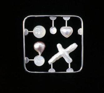 The Kit series was based on the childhood activity of building plastic models by snapping off, and gluing together, the small parts secured on a moulded plastic frame. (fig 6.7) These Airfix kits were commonly associated with fabricating together warships, aircraft bombers, tanks and vehicles, and so on. I wanted my works to convey the possibility of constructing sentiments of love, relationships, emotions and feelings. Therefore the Love Kit series and Season Kits used imagery as metaphor to imply that we could snap these parts off and construct a bigger picture than the sum of the parts suggest. They imply active participation, of selecting, of wanting to make things work. (figs 6.8 – 6.18) As mentioned previously Memory Kit explored, through the trigger of the object as metaphor, memories and activities associated with childhood; the repetitive constructing of larger objects from small Lego pieces, the carved rabbit remembered as family pet, the shell as summer holidays, the ruler remembered as school and the passing of time.